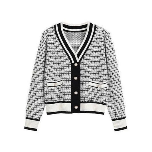 Fashion Plaid Short Cardigan Women's V Neck Knitted Sweater